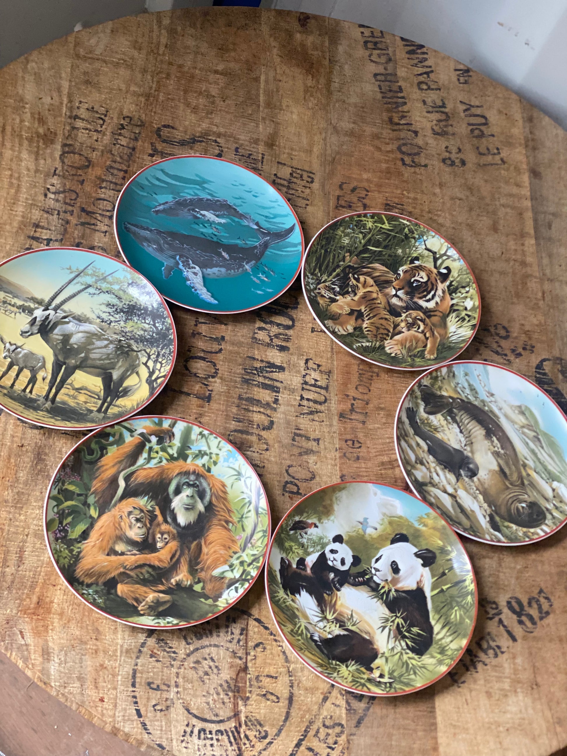 Each plate features a different endangered animal, such as tigers, pandas, whales, and orangutans.